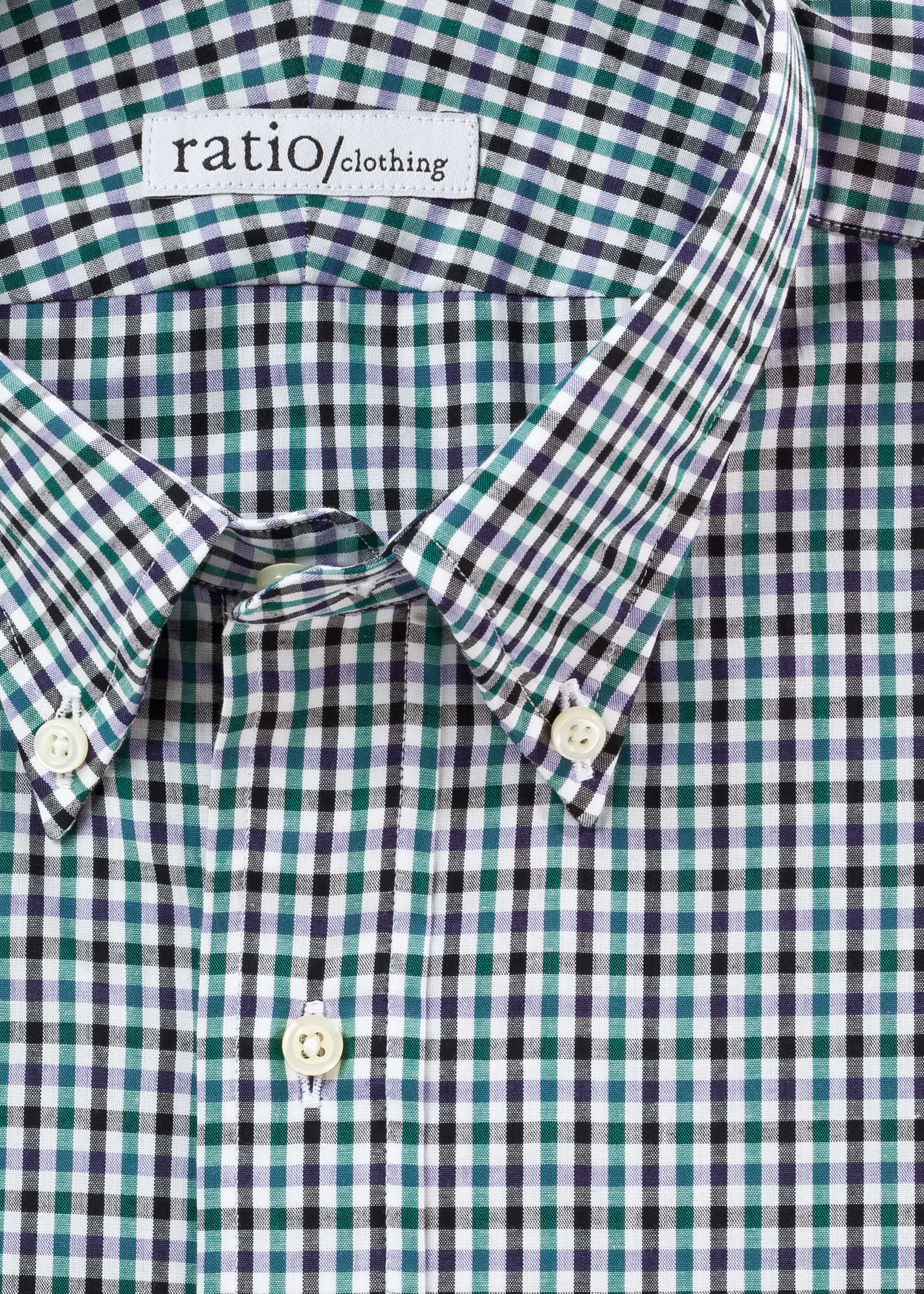 - Green and Navy Mini-Gingham custom dress shirt. Handmade in the USA with single-needle stitching at sixteen stitches per inch. Two-piece yoke for ease-of-movement. Quarter-inch topstitching on cuff, collar and placket. Removable collar stays.